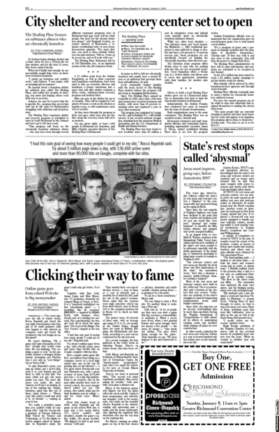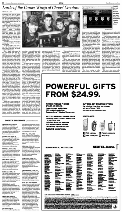 Two years ago this week, over the lull of winter break, Rocco Repetski got bored the way high school juniors who happen to be math geniuses (and who happen to take interest in computer code) get bored. He wondered, why not design an online game? He wasn't thinking, "Oh, a game will make thousands of dollars," though that would come later. He was thinking, "Oh, creating a game is cool," in the particular manner a teenager deems instant messaging and PlayStation 2 not only as "cool things" but as "facts of life." To play Repetski's game, you sign up online, you get a secret link, you send it to your friends, you tell them to click on that link. The more clicks you get, the more points you earn. The more alliances you make, the more chance you'll have at landing on top of the ranking list. Simple, harmless, quick fun, like one of those chain letters -- "Please copy this entire e-mail and send it to 10 friends" -- waiting in your in box. "It's really a primitive game that you couldn't really do anything with," says the 18-year-old, a graduate of Thomas Jefferson High School for Science and Technology, or TJ, the highly selective magnet school in Alexandria. In Repetski's mind, the game could only get better. So it did. Together with Ben Gelb, Aman Gupta and Nick Meyer, also TJ graduates, Repetski developed Kings of Chaos, or KoC. It is a "massively multi-player online role-playing game" -- a mouthful, like its acronym, MMORPG -- inspired by Middle Earth, with humans, elves, dwarfs and orcs battling for survival. Not coincidentally, the free site took off at about the same time "The Lord of the Rings: The Two Towers" reigned at the box office. "I had this sole goal of seeing how many people I could get to my site," says Repetski. Try about 5 million page views a day, with 136,488 active users and more than 90,000 hits on Google, complete with fan sites. How a simple online game like KoC can balloon from being on a computer server of a local high school into one of the top 50 gaming sites on the Internet -- a few spots below FreeArcade.com and Nintendo.com, with a gross revenue of more than $175,000 this year -- is a big, big surprise. Even to its creators, who in the past eight months have each received a check, the exact amount they'd rather not say. The money, they admit, helps pay for their freshman year in college -- and for "some toys," adds Meyers, half-smiling. This is proof, pure and clear, of a highly democratic Internet, which in its laissez-faire, anything-goes paradigm allows something as ingeniously entrepreneurial as this to happen. From that winter break in 2002, when Repetski put the game on his school Web site, it took only a few weeks before TJ's server couldn't, and shouldn't, handle the game's online traffic, the group decided. "We figured we had to get more serious," Gelb says. They needed their own top-of-the-line servers -- four of them at a cost of $20,000 and a monthly fee of about $1,500, paid for out of the game's revenue. Never mind that the creators were high schoolers who'd run from their U.S. history class in room 219 to the computer systems lab in room 115 to check on their business. "It does and it doesn't surprise me. These kids are digitally inclined, and, as a result, they are adept at utilizing tools that are available to them now. It doesn't require a large-scale infrastructure to support a business opportunity on the Internet," says Michael Dowling, general manager of Nielsen Interactive Entertainment. Having upwards of 130,000 users is more than a respectable figure, adds Dowling, considering that well-known, well-budgeted, pay-to-play MMORPGs such as Everquest II and Star Wars Galaxies are attracting 350,000 and 250,000 users, respectively. "But it's crazy to really think about what these kids have done, isn't it?" The game's users, 90 percent of them male, with an average age range of 13-21, are mostly in the United States, though there are some in Britain, Belgium, the Netherlands and Australia, according to a user survey conducted by the site last year. Randy Latimer has gotten over the initial shock, the star-struck quality of it all. Latimer, the director of the computer systems lab at TJ, taught Gelb, Gupta and Meyer. "I'm a musician on the side," says Latimer, who plays violin, guitar and drums. "For any musician, writing the hit song is the holy grail. But who's got the magic formula to do that? It's timing, yes. It's skills, yes. It's both. I've always thought that what they've done is like writing that hit song. Except they worked as a team. They weren't a bunch of kids sitting alone in front of the computer." On a recent weekday, Repetski, of nearby Oakton, is leaning on a long dining table, at the Gelbs' four-bedroom Vienna home, surrounded by Gelb, Meyer, of Alexandria, and Gupta, of Chantilly. They're on winter break, this time from college. Mr. Gelb, as the father of the house is known, is sitting on the table, positively glowing. Mrs. Gelb, who's eating a late lunch in the kitchen, yells out, "Skiing!" when her son is asked about his other hobbies. ("She doesn't want him to be seen as a computer geek," says Mr. Gelb, who runs a PR consulting firm.) In a way, the quartet -- three white, one Asian -- are a reflection of TJ, a school of about 1,600 high-achieving kids from middle- to upper-middle-class families, most of them white, a lot Asian, all with access to their own Web space in the school's server. Gelb, Meyer and Repetski are freshmen at Massachusetts Institute of Technology; Gupta, the "slacker-master programmer" type who's too smart for school, is thinking of dropping out of George Mason University. "You're not dropping out," says the younger Gelb. "I'm not seriously considering it," replies Gupta. "But in the back of my mind, I know I probably won't finish college." They're close friends, the usual clique with a ping-pong-like way of completing each other's sentences and a history of too many Cokes and cheese pizzas with grille